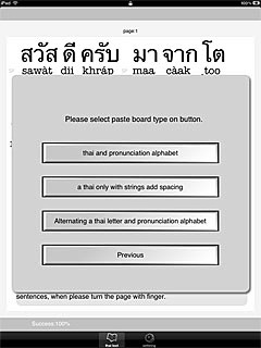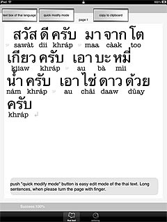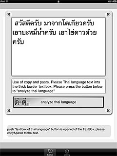 Application Title: Thai pronunciation analysis Copy Paste for iPad This app can add phonetic symbols to a display of the Thai sentence. Copy Paste of a thai sentences, next touch a analysis button. Very easy. Thai language is a very complexity character. When learning the Thai language, Examine the pronunciation of the sentences are very time consuming. This app is useful for analyze of a Thai text. quickly and easy. IPad Edition feature. 1. interface like a Book. turn the pages read, a long sentence. 2. Large Thailand characters. 3. "quick modify mode" button press can change result pronunciation. 4. Select format to copy to pasteboard. 3 types available.(thai+pronunciation,thai+space, turn thai and pronunciation) Notes for Automated analysis of the structure... 1. Pronunciation of the word unique is impossible. 2. One character reread letters omitted, is impossible. I want continue improve my invention, for exact analysis pronunciation. Thanks! Arigato Gozaimasu! |