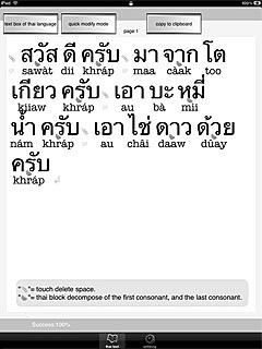 タイ語でコピペ発音解析 for iPad タイ語の文章からタイ語に含まれる発音記号を表示します。 コピー&ペーストして発音解析ボタンを押すだけです。 タイ文字の文章はとても複雑です。 タイ語を学習するとき、その文章の発音を調べるのはとても時間がかかります。 「タイ語の文に発音記号を表示してくれるアプリがあればいいのに…」 このアプリはタイ語の文章表示に発音記号を追加することができます。 文章をテキストボックスにコピー&ペーストして、ボタンを押すだけで瞬時に自動解析します。 本アプリはiPad専用です。iPhone版『タイ語でコピペ発音解析』アプリも別にございます。 ◎iPad専用版『タイ語でコピペ発音解析』の特徴。 1.ブック風のインターフェースでページをめくるように長い文章を読むことが出来ます。 2.大きく見やすいタイ文字。 3.簡単修正モードボタンを押すと、自動修正の内容を変更することができます。 4.ペーストボードにコピーする形式を、a. タイ文字+発音記号、b. タイ文字のみ、c. タイ文字と発音記号を交互、の3タイプから選択可能。 注意 自動解析の構造上、その単語固有の発音や一字再読字は省かれたまま表示されます。 例えば「パタヤー」は「パッ・ヤー」のような発音で表示されます。 これらの慣習的な読みの単語は、現地の人との会話や複数の書籍から確かめる方が確実です。 より忠実な動作を目指して随時調整中です。 発音の表記をオプションで変更できます。 ・末子音の発音記号を"t"→"d", "p"→"b"に変更する。 ・母音の発音記号のうち"ไ□"の発音記号を"ai"→"ay"に"เ□า"を"au"→"aw"に変更する。 ・母音の発音記号のうち"เ□า"の発音記号を"ao"に変更する。 |