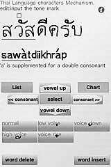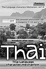 Application Title: Thai Language character Mechanism. The mechanism of Thai characters, you can master the feeling of hitting the keys of the alphabet. Select from the buttons to display thai. Learn by assembling a Thai. Thai language character is a great complexity. The combination of "consonant" + "vowel" + "consonant". This app, "first consonant" → "double consonant" → "vowel" → "final consonant" → "tone mark" assemble in the order to Thai Language. Thai consonants, Thai vowels, Thai number, repetition mark, ellipsis, supported by the app. Thai tone marks a change of character attributes. final consonant phonetic symbols, the "t", "p", or, "d", "b" Options can be changed. Thai characters in literature by a different mechanism. All the mechanisms of Thai characters, can not be incorporated into this application. Thai character mechanism analyze for programming. expend in the 3 years. Limited to the basic mechanism of some Thai characters. Can now operate. Thai input characters are saved automatically. "Consonant + vowel + consonant" with 20 pieces. Can save up to 30 lines. Please try you think. Thank you. Arigato gozaimasu!! |
