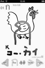 Application Name:thai language "Koh-kai" This application is display a "Koh-Kai" character table. "Koh-Kai" is language character table of Thailand. It is like alphabet character table. I goes travel to Thailand. Thai language signboard is seen, in town and airport. I want to read a Thai character typeface. Thai language character is a great complexity. The combination of "consonant" + "vowel" + "consonant". "koh-kai" a consonant of 42. memorize a "Koh-kai". help to read of thai language signboard with travel. This application continues to display repeat to thai character of 42. Anytime and anywhere, please read "Koh-kai". Options: 44 characters, including old letters. Adjust speed. Night mode. See you at Khaosan Road in Thailand! Thanks! Arigato gozaimasu! |