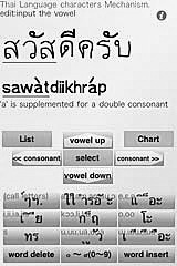 タイ語の文字のメカニズム タイ語の文字のしくみを、アルファベットのキーを打つような感覚で表現できます。 表示されるボタンからタイ文字を選び、文字全体を組み立てながら覚えられます。 タイ文字の構造はとても複雑です。 タイ文字の基本の形は「頭子音+母音+末子音」です。 このソフトは「頭子音」→「二重子音」→「母音」→「末子音」→「声音記号」の順番でタイ文字を組み立てていきます。 子音と母音に加えて、タイ数字、繰り返し記号、省略記号もサポートします。 文字属性によるタイ文字の声調の変化もサポートしました。 「中子音字/無気音」「低子音字/有気音」「高子音字/有気音の高音」「低子音字・単独字/有声音」 「低子音字の高子音化/有声音の高音(ホーナム)」 文字属性によるタイ文字の声調記号の変化も処理します。 "平音"、"低声"、"下げ声"、"高声"、"上げ声" 末子音の発音記号は、"t"、"p"を記すものと、"d"、"b"を記すものをオプションで変えられるようにしました。 タイ文字は大変複雑で、文献や地域によっても少しずつしくみが異なるため、 そのままアプリにタイ文字の機構を全て網羅するのは困難でした。 プログラム用に解析するのに3年ほどかかりました。 今回いくつか基本的なしくみに限定したことで実用が可能になりました。 1.hは発音せず次の文字を高子音字にするホーナム。 2.複合子音字とも呼ばれる、'l','r','w'の完全な二重子音。 3.疑似二重子音のため'a'を補うしくみ。 4.繰り返し記号による2度読み。 5.左の文字の繰り返しを示すしくみ。 6.黙字符号のついた文字は発音しない 7.一字再読字(末子音+頭子音の省略)。 8.次の文字を中子音字にするオーナム。 9.省略記号 10.省略語 組み立てたタイ文字は終了時に自動的に記録されます。 1行の文字数は「頭子音+母音+末子音」を20組まで。 行数は30行まで記録できます。 |
